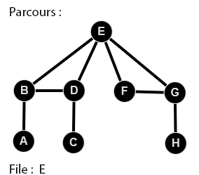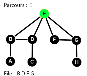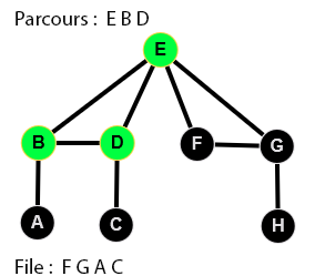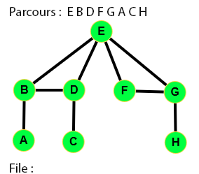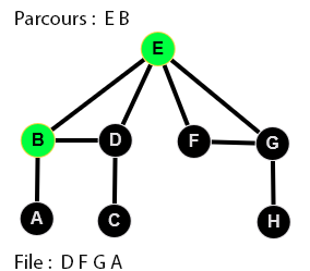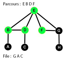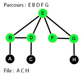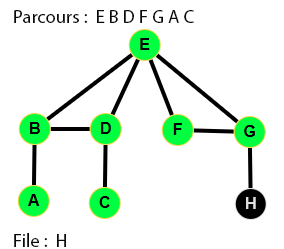 On retrouve bien dans la liste renvoyée par la fonction de parcours en largeur à partir du sommet A les sommets classés par ordre de distance croissante au sommet A : ['A', 'B', 'D', 'E', 'C', 'F', 'G', 'H'].