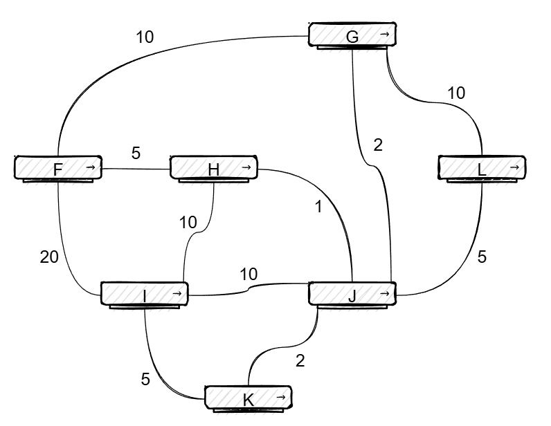 Le message sera acheminé du réseau F vers le réseau I en passant successivement par les routeurs H, J et K. En effet, avec ce trajet, le coût sera égal à 5 + 1 + 2 + 5 soit 13. Tout autre trajet aura un coût plus élevé.